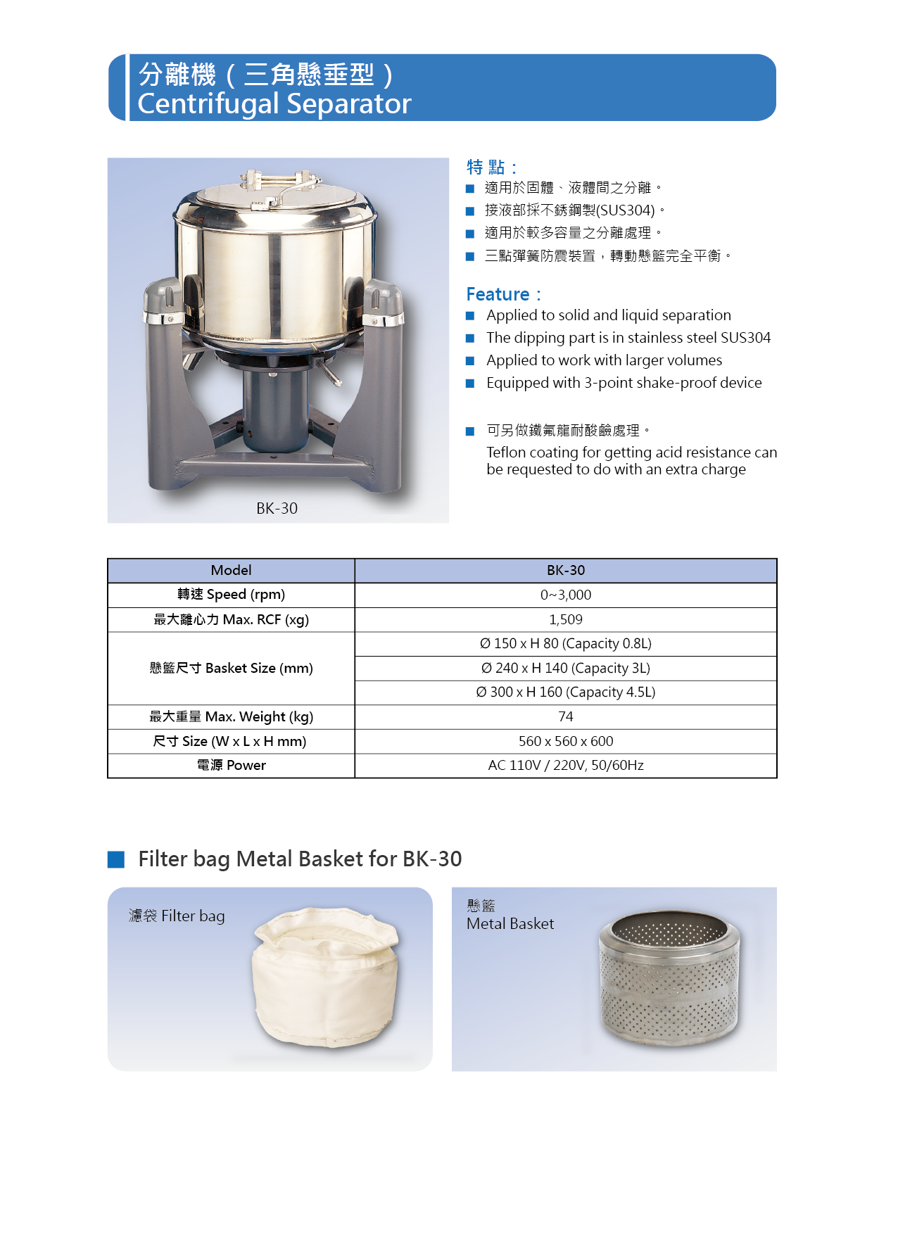 ● BK-30分離機規格: