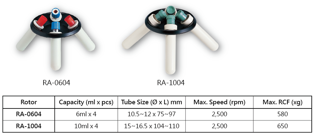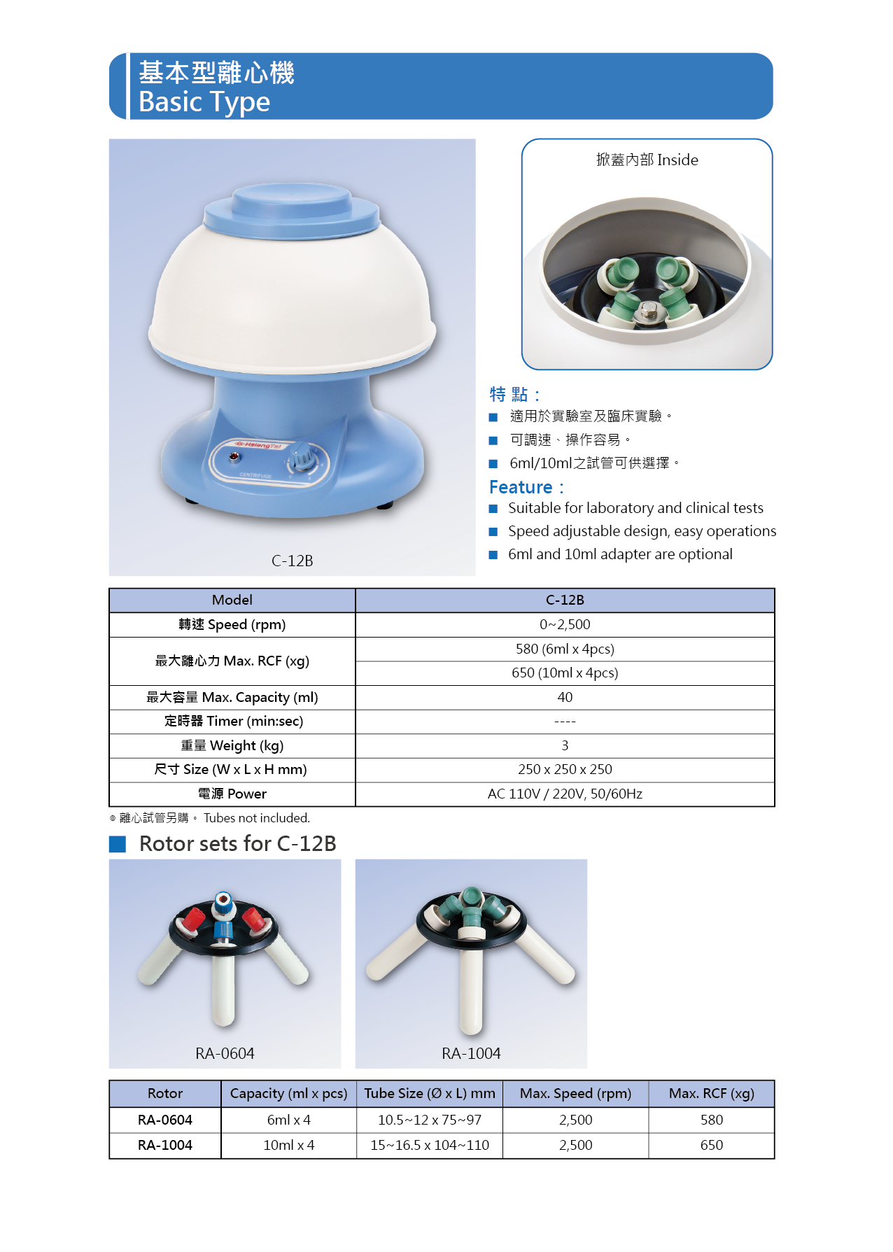 ● C-12B基本型離心機特點: 1、適用於實驗室及臨床實驗。 2、可調速、操作容易。 3、6ml/10ml之試管可供選擇。 ● C-12B基本型離心機規格: Model C-12B 轉速 0~2,500 rpm 離心力 580 xg (6mlx4pcs) / 650 xg (10mlx4pcs) 最大容量 40 ml 重量 3 kg 尺寸 W250 x L250 x H250 mm 電源 AC 110/220V, 50/60Hz ● C-12B基本型離心機轉盤 RA-0604,RA-1004用轉盤 : ●離心管另購。 ►型錄p.1