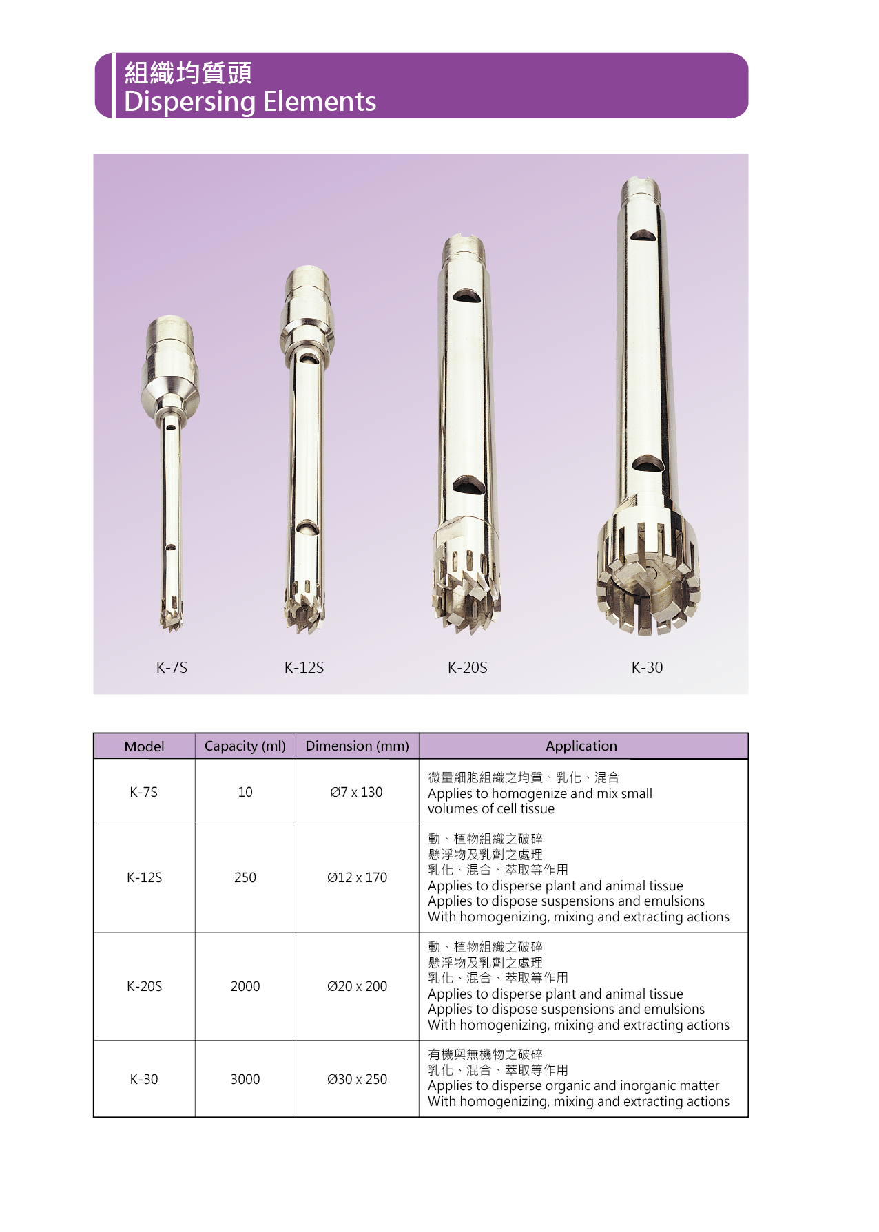 | 用途 | 微量細胞組織之均質、乳化、混合 | 動、植物組織之破碎 懸浮物及乳劑之處理 乳化、混合、萃取等作用 |