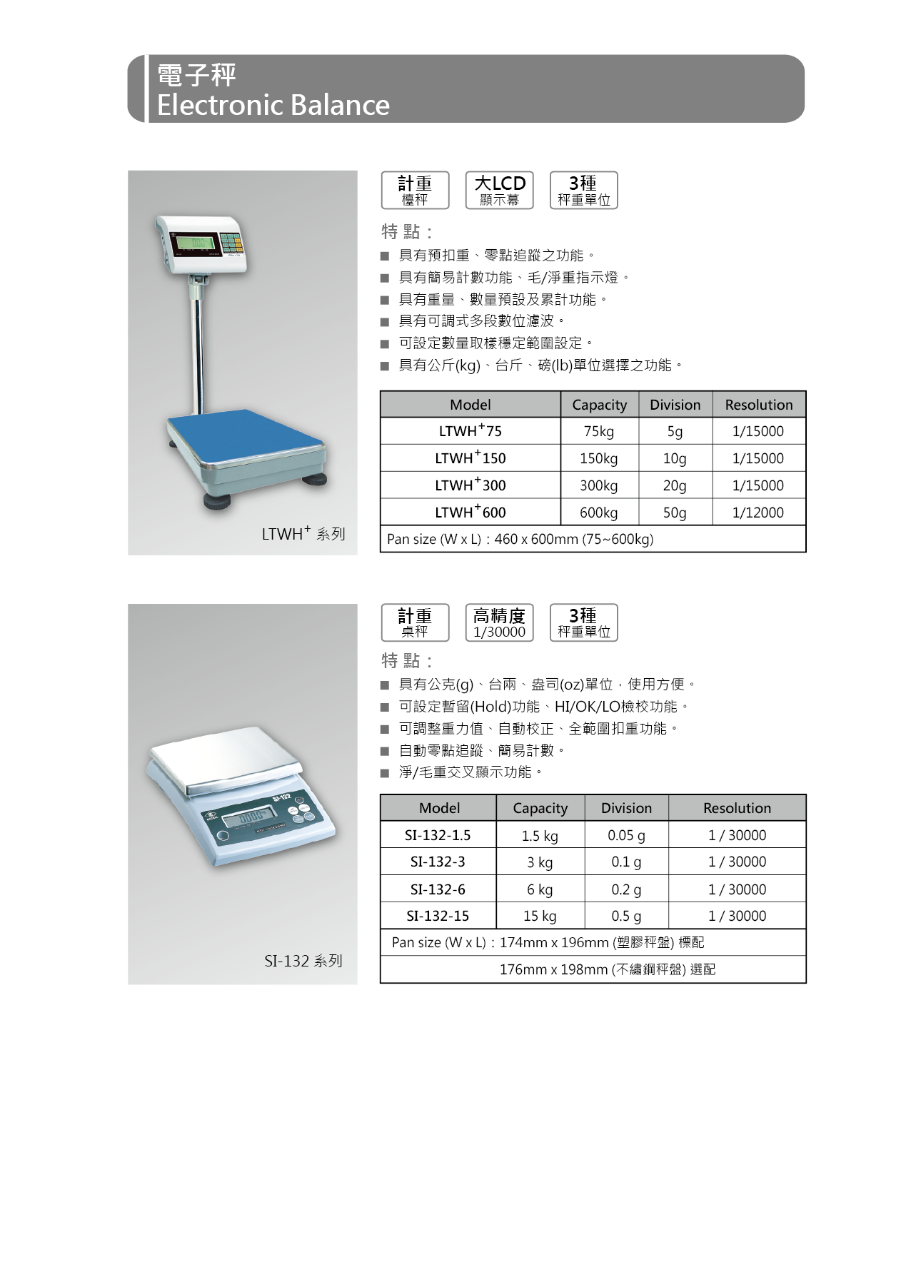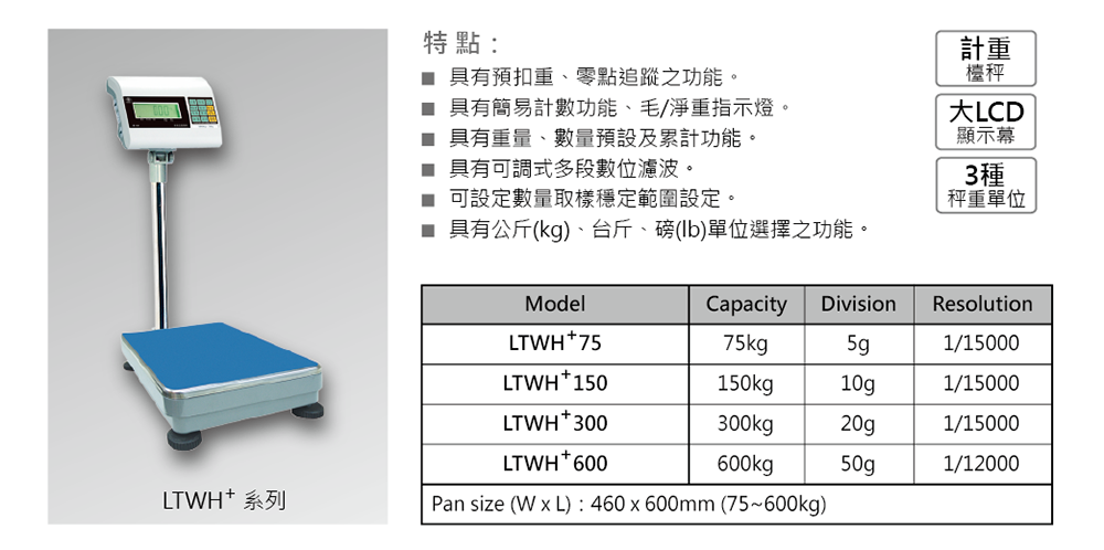 抗干擾能力(EMS+EMI),具有Lo/Hi/Ok檢校、重量數量超過範圍警示功能,具有三種重量暫留功能。